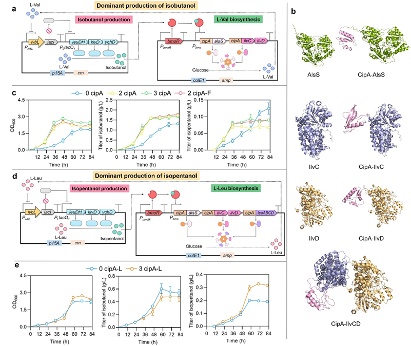 目標(biāo)產(chǎn)物異丁醇和異戊醇結(jié)構(gòu)十分相似,實(shí)際生產(chǎn)過程中的混合生產(chǎn)會(huì)導(dǎo)致產(chǎn)物分離純化困難、目標(biāo)產(chǎn)物生產(chǎn)效率低等問題。因此,本文在已構(gòu)建的動(dòng)態(tài)調(diào)控系統(tǒng)基礎(chǔ)上,偶聯(lián)CipA自組裝系統(tǒng)聚集目標(biāo)氨基酸合成途徑中的關(guān)鍵酶,推動(dòng)單一氨基酸的快速積累,實(shí)現(xiàn)前體物向目標(biāo)產(chǎn)物的迅速定向轉(zhuǎn)化,從而提高目標(biāo)產(chǎn)物的合成效率。該策略避免了因異丁醇與異戊醇生產(chǎn)途徑部分重疊所導(dǎo)致的混合生產(chǎn)問題,實(shí)現(xiàn)了對目標(biāo)高級醇的精準(zhǔn)動(dòng)態(tài)調(diào)控(圖2)。