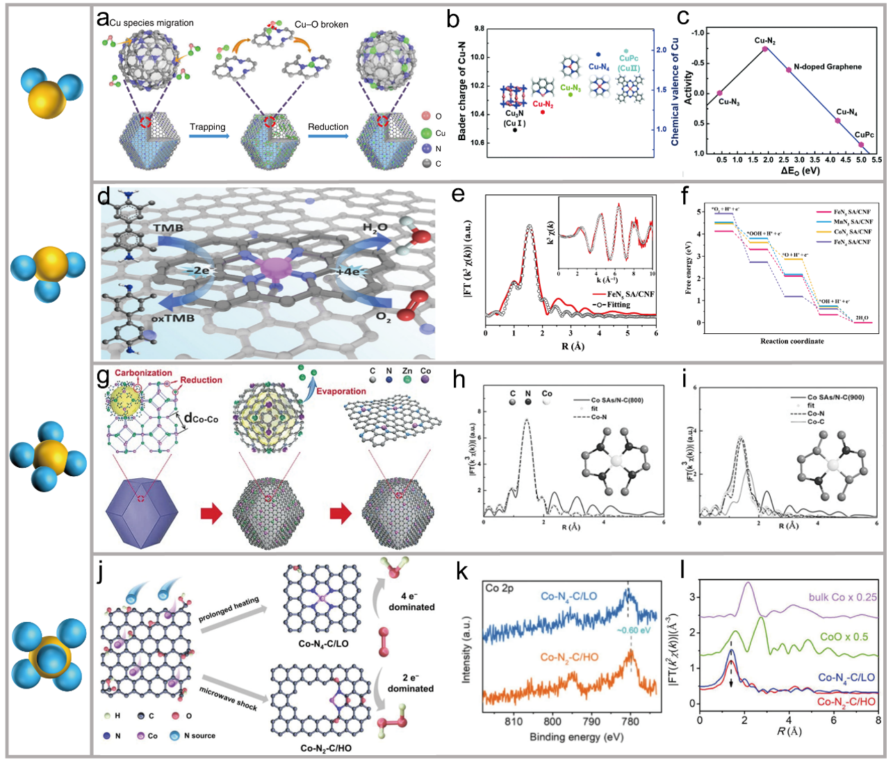 中心活性金屬的配位數已被證明與中間吸附有內在的關系,從而與催化活性有內在的關系。為了揭示配位數調控的機理,人們探索了多種策略。其中,基于高溫煅燒和還原的控制策略對氮配位數進行了精確調控。