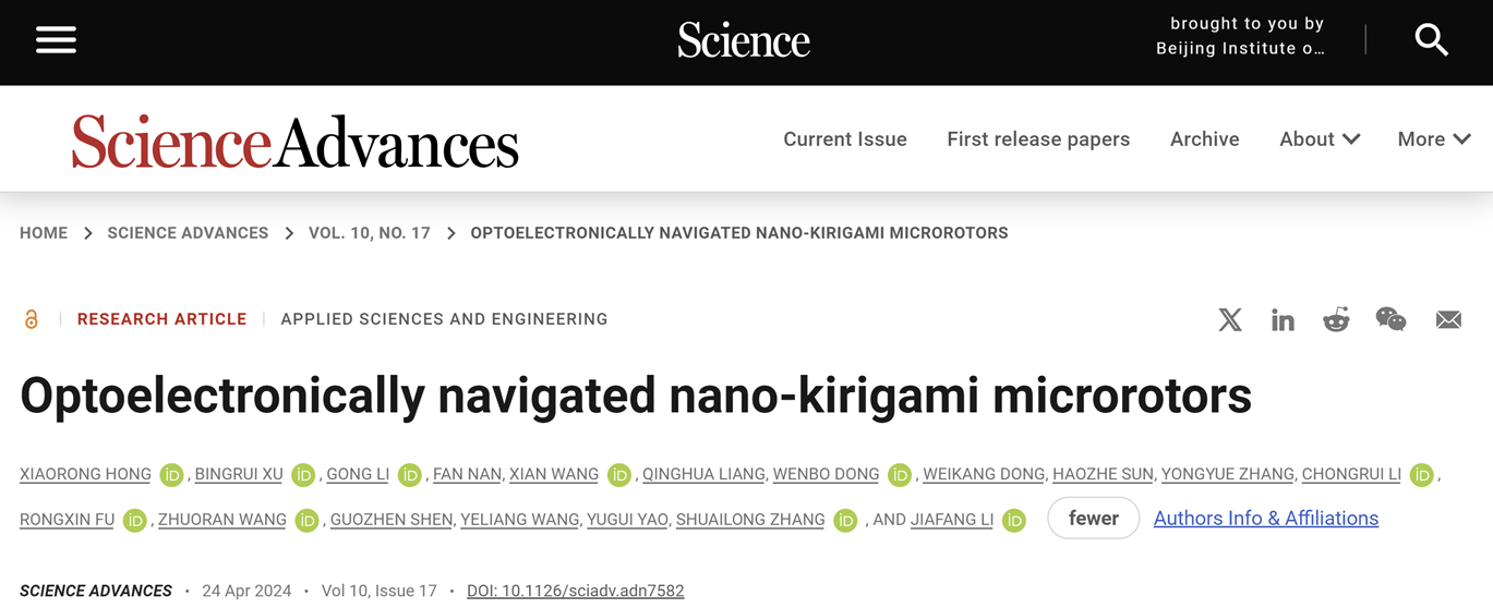 文章信息(#為共同一作;*為通訊作者):Xiaorong Hong#, Bingrui Xu#, Gong Li, Fan Nan, Xian Wang, Qinghua Liang, Wenbo Dong, Weikang Dong, Haozhe Sun, Yongyue Zhang, Chongrui Li, Rongxin Fu, Zhuoran Wang, Guozhen Shen, Yeliang Wang, Yugui Yao, Shuailong Zhang*, and Jiafang Li*. Optoelectronically navigated nano-kirigami microrotors. Science Advances, 10(17), adn7582 (2024).