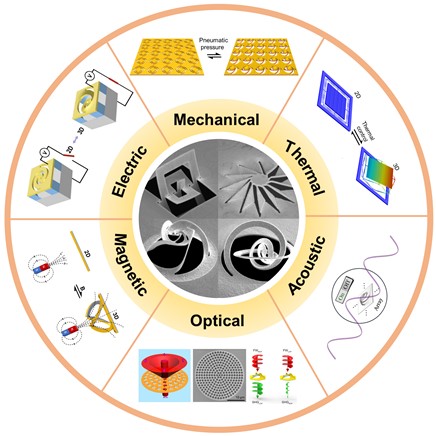 圖5:納米剪紙結構的多物理場協同調控研究(Nano-kirigami/origami fabrications and optical applications, Appl. Phys. Lett. 124, 160501 (2024), Front Cover, doi: 10.1063/5.0199052)。