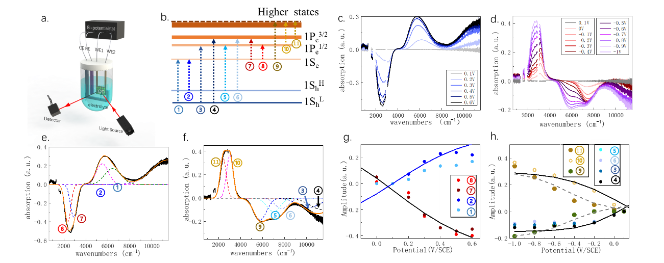 帶內躍遷紅外材料體系,對摻雜精確調控和載流子輸運控制提出了更高的要求。該工作開發了帶內躍遷膠體量子點混相配體交換方法(圖1),可以有效減小量子點之間的間距,實現表面偶極子摻雜精確調控,并且使得材料在空氣環境下穩定。并且搭建了光譜電化學平臺(圖2),獲得精確的HgSe膠體量子點能帶結構,證明材料中無明顯缺陷態。