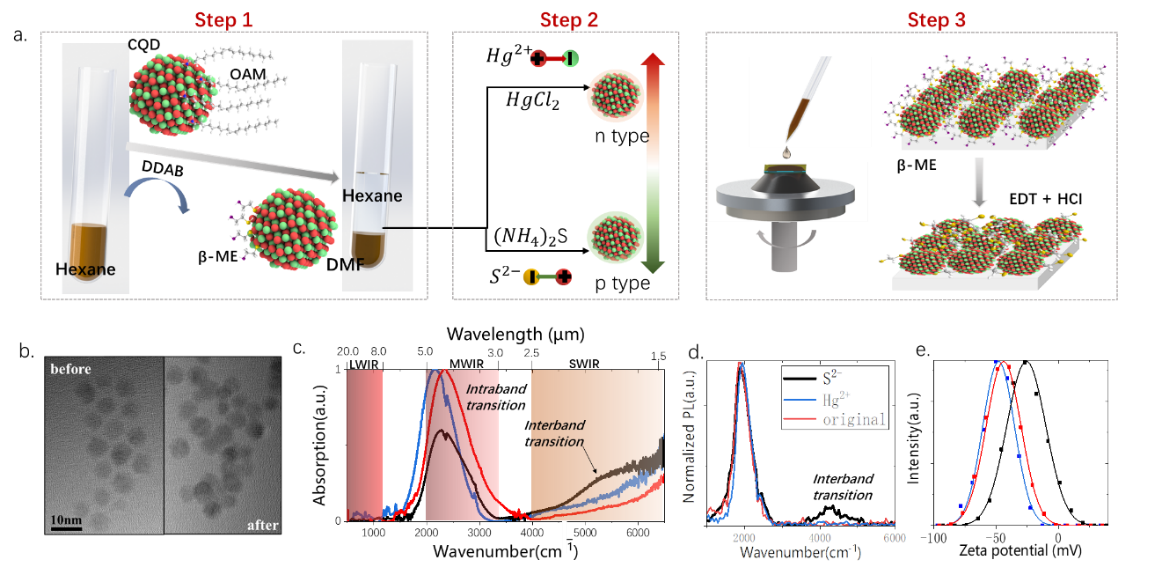 北京理工大學光電學院郝群教授團隊成員陳夢璐準聘教授、唐鑫教授在《ACS NANO》期刊上發表了題為“Mid-Infrared Intraband Photodetector via High Carrier Mobility HgSe Colloidal Quantum Dots”的文章,利用低成本膠體量子點導帶中1Se到1Pe的能級躍遷,實現低成本中波紅外帶內躍遷探測。