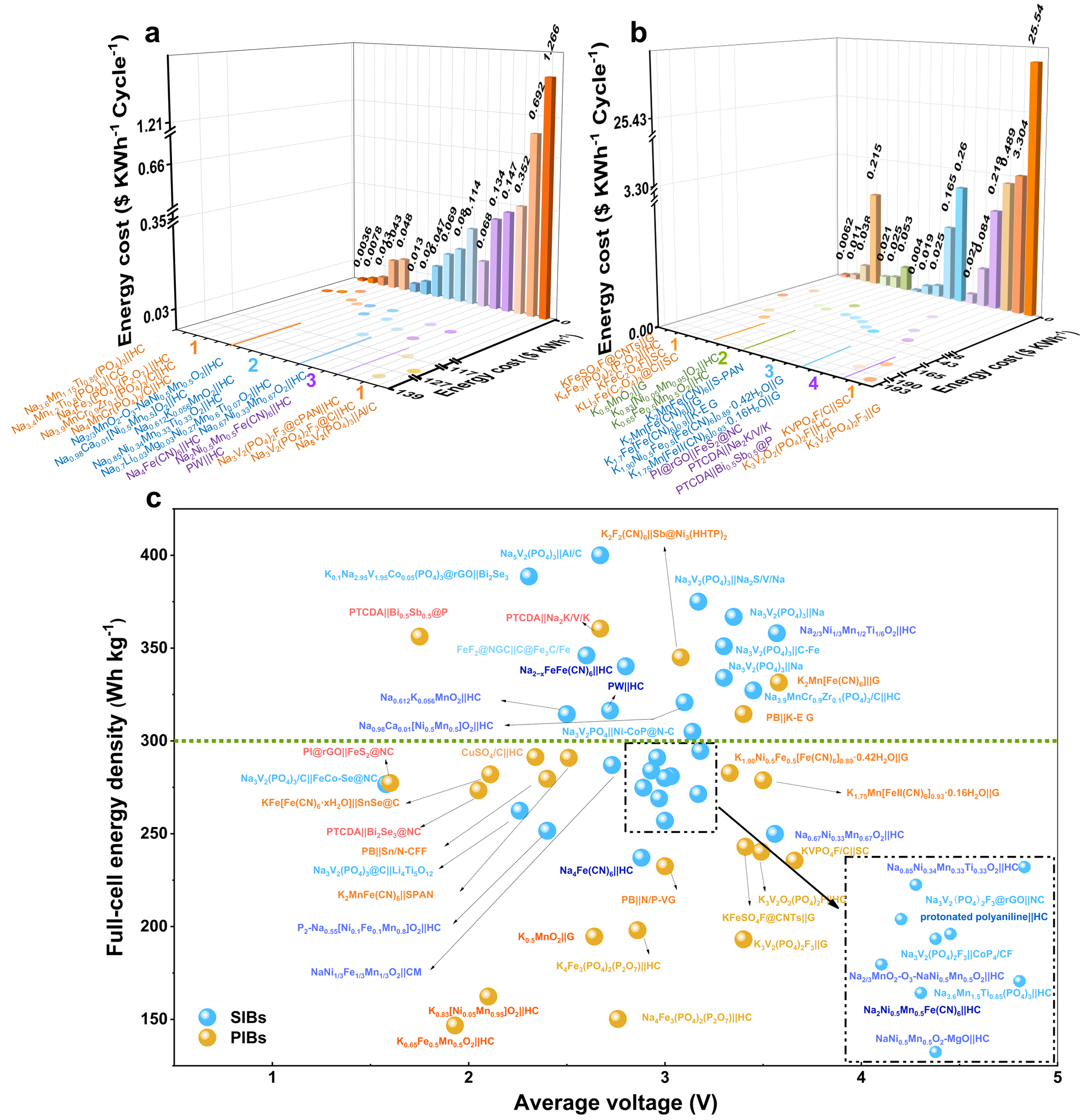 評估新興技術(shù)的一個重要標準是其經(jīng)濟可行性,以能量為基準的成本分析被視為確定這些技術(shù)可持續(xù)性的有效工具。鋰資源的稀缺和大幅增加的需求將顯著提高鋰離子電池(LIBs)的價格,外加其低安全性,最終限制了LIBs的商業(yè)可行性,使其難以負擔大規(guī)模的工業(yè)應用;另外,目前LIBs的能量密度正接近其飽和極限。相比之下,鈉/鉀金屬成本低,其電池體系可使用廉價的集流體。鈉離子電池(SIBs)表現(xiàn)了更好的熱穩(wěn)定性和低溫性能、更寬的溫度適應范圍。鉀離子電池(PIBs)在熱失控時產(chǎn)生的熱量要比LIBs少得多,具有更高的安全性。SIBs和PIBs的低成本優(yōu)勢為其在大規(guī)模儲能應用中開辟了道路。本綜述引入了成本效益($ kWh-1·cycle-1)這一重要參數(shù),通過總結(jié)近年來的研究進展,基于正極材料的分類,評估并對比了各種鈉離子、鉀離子和鋰離子全電池體系的成本效益,從該角度出發(fā),給出了SIBs/PIBs在某些特定場景中取代商業(yè)化LIBs所需達到的能量密度;并進一步對比分析了SIBs和PIBs的電化學行為,其差異表明SIBs是目前大規(guī)模儲能應用的首要選擇;令人鼓舞的是,更高的電池電壓、可實現(xiàn)的K+嵌入石墨負極的過程,特別是在高電流密度下高效的充放電過程,良好的循環(huán)穩(wěn)定性,賦予PIBs極大的可能性,在未來應用于大規(guī)模儲能中。