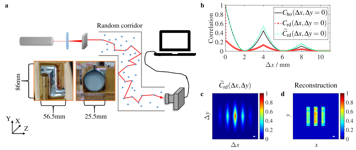 圖2 成像位于隨機走廊兩個拐角后的隱藏目標。a 實驗成像系統原理圖。b 隱藏目標自關聯函數、散斑光強關聯函數、重整化散斑光強關聯函數三者的對比。c 重整化散斑光強關聯函數。d 由重整化散斑光強關聯函數重建出的隱藏目標圖像。