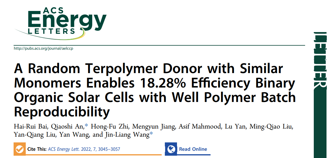 近日,北理工化學與化工學院王金亮教授團隊在構筑高效率且批次穩定的有機太陽能電池聚合物給體材料方面取得重要進展,相關研究成果發表在國際能源領域著名期刊《ACS Energy Letters》(DOI: 10.1021/acsenergylett.2c01316)上,題為“A Random Terpolymer Donor with Similar Monomers Enables 18.28% Efficiency Binary Organic Solar Cells with Well Polymer Batch Reproducibility”。北京理工大學為唯一作者通訊單位,化學與化工學院王金亮教授與安橋石特別研究員為該論文的通訊作者,博士研究生白海瑞為論文的第一作者,本科生劉明樵(其本科畢業論文被評為2021年北京市普通高等學校優秀本科生畢業設計(論文))為共同作者。