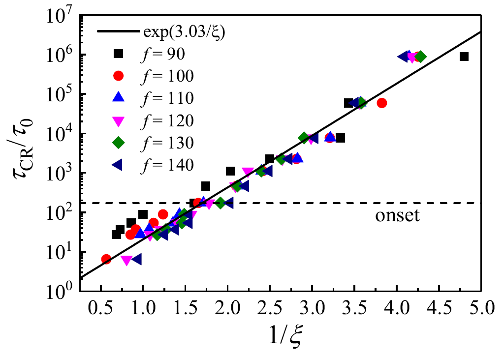 團隊設計了新的探測玻璃體系靜態結構的手段,具體為,在短時間內,對粒子施加一固定大小,方向隨機選取的力,觀察撤去力之后,粒子不能回彈的位移,即不可逆位移有多大。圖1(a)展示了當對粒子在0.1(約化單位)時間間隔內施加一外力大小為f = 100(約化單位)的力時,粒子平均位移隨時間的演化規律。較長時間下,此平均位移趨近一平臺值,即黑色虛線標出的不可逆位移L(T, f),顯然,溫度越低,不可逆位移L(T, f)越小。近一步的研究發現,L(T, f)正比于 T  -  T 0 (圖1 (b)),其中 T 0為Vogel–Fulcher–Tammann (VFT) 方程預測的非晶體系的理想玻璃化轉變點,因此,L(T, f)在理想玻璃化轉變點外推為0。進一步分離變量,我們可得到L(T, f) = ξ(T)A(f), 其中塑性長度ξ(T)∝( T  -  T 0 ), A(f) ∝( f  -  f 0)。塑性長度ξ(T)與體系弛豫時間存在指數依賴關系(圖2),因此建立了塑性長度與非晶體系慢動力學的聯系。