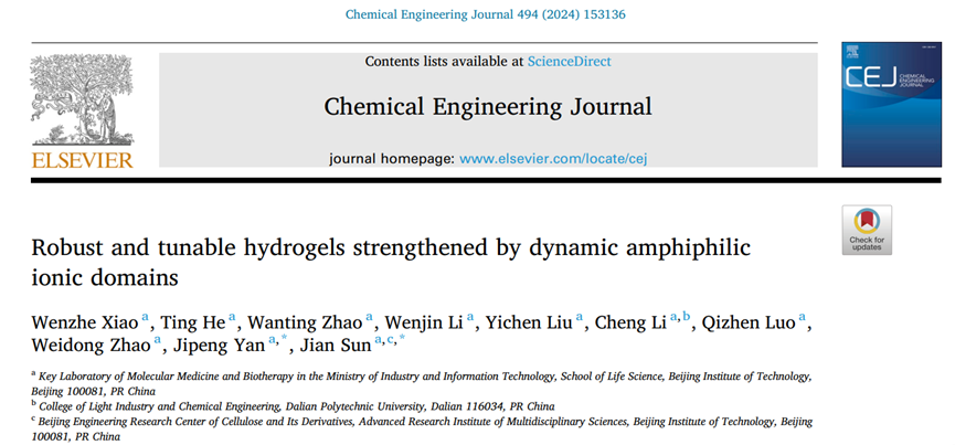 論文詳情:Wenzhe Xiao, Ting He, Wanting Zhao, Wenjin Li, Yichen Liu, Cheng Li, Qizhen Luo, Weidong Zhao, Jipeng Yan,* Jian Sun*, Robust and tunable hydrogels strengthened by dynamic amphiphilic ionic domains. Chem. Eng. J. , 2024, 494, 153136.