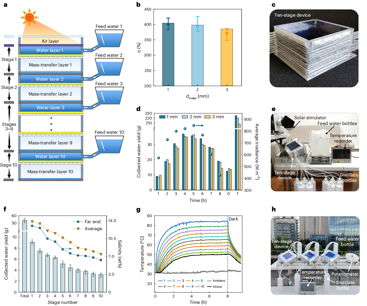 太陽能海水淡化是緩解全世界范圍內淡水短缺的有效方法,同時助力于碳中和目標的實現。近期,由太陽能驅動的逆向蒸餾方式展現出了令人驚嘆的產水性能,其能量轉化效率遠超傳統太陽能蒸餾方式。然而,現有逆向蒸餾系統的高蒸發速率導致了海水中的鹽離子在蒸發材料表面結晶,影響了系統的可持續性,嚴重阻礙了其長期大規模的實際應用。為此,文章提出了一種基于水層逆向蒸發的太陽能蒸餾方法。在這項工作中,使用太陽能吸收器、微孔疏水膜、不銹鋼支撐網形成一個具有一定厚度的穩定水層。這一水層替代了以往研究逆向蒸餾系統中的親水材料,同時實現逆向蒸發功能和抗鹽功能。一個位于高處的供水體通過連通的管路在重力的驅動下自動地給水層持續補水。水層的上方和下方分別設置透明的對流蓋板和冷凝鋁板以分別實現隔熱和冷凝功能。此外,將多個水層疊層放置形成具有回熱功能的多級逆向蒸餾結構。