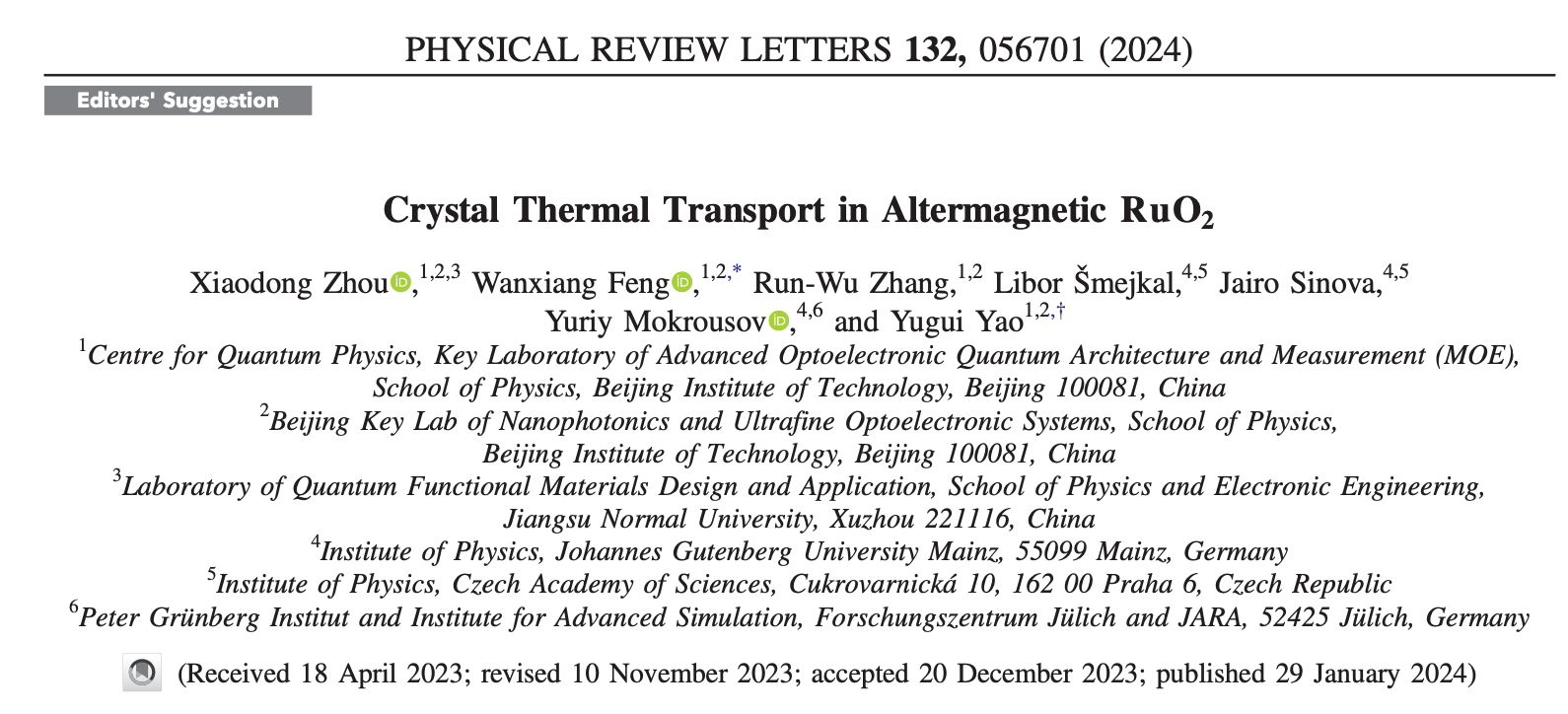 近日,北京理工大學物理學院姚裕貴、馮萬祥教授團隊在交錯磁體的研究中取得重要進展,發現了由晶體時間反演對稱性破缺導致的晶體熱輸運現象。該工作以“Crystal Thermal Transport in Altermagnetic RuO2”為題發表于國際頂級期刊《Physical Review Letters》,并被選為編輯推薦(Editors' Suggestion)。
