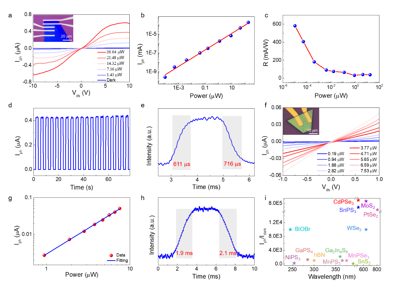 為了進一步研究其光電性能,制備了基于CdPSe3和SnPS3納米片的光電探測器。所有測試均采用520 nm激光。不同功率強度下,CdPSe3器件的功率依賴性光電流的對數形式與功率密度呈正相關。通過Iph≈Pθ可以很好地擬合,其中θ是與光響應強度相關的指數。此外,線性動態范圍(LDR)是光電探測器的一種性能指標,用于表征光強范圍,在此范圍內光電探測器保持恒定的響應率。根據LDR = 20log(Iph/Idark)的公式計算得出光敏LDR為120 dB,遠大于商用InGaAs光電探測器的66 dB和其他二維材料如GaPS4的62 dB。基于CdPSe3的光電探測器響應度可高達582 mA/W,對應的比探測率為3.19′1011 Jones,對可見光的探測能力極佳。上升時間和衰減時間分別為611 ms和716 ms,優于大多數其它已報道的二維TMPCs光電探測器。值得注意的是,CdPSe3和SnPS3光電探測器由于其超低暗電流,比其它報道的二維材料具有更高的開關比。