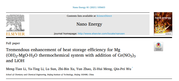 近期,北京理工大學(xué)化學(xué)與化工學(xué)院武欽佩教授團(tuán)隊(duì)在儲(chǔ)能科學(xué)技術(shù)領(lǐng)域取得階段成果。研究成果以“Tremendous enhancement of heat-storage efficiency for Mg(OH)2-MgO-H2O thermochemical system with addition of Ce(NO3)3 and LiOH”為題,12月18日在線發(fā)表于 Nano Energy (https:///doi.org/10.1016/j.nanoen. 2020.105603)。北京理工大學(xué)化學(xué)與化工學(xué)院研究生李夢(mèng)甜和李亞婷為共同第一作者,北京理工大學(xué)是唯一作者單位。