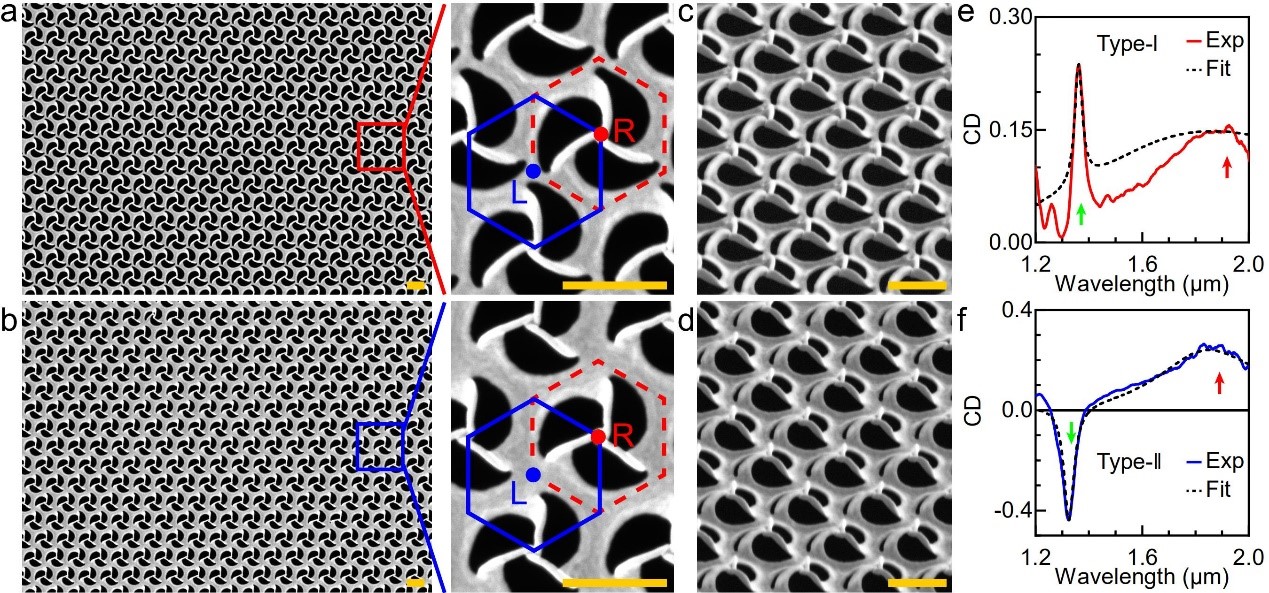 針對這一難題,研究團隊采用自主發展的納米剪紙技術[Sci. Adv. 4, eaat4436 (2018), Adv. Mater. 32, 1907077 (2020), Nat. Commun. 12, 1299 (2021)],通過引入微擾構建了兩個幾乎一致的雙幾何手性人工旋槳超分子陣列結構,實現了圓二色性劇烈的符號反轉。理論分析表明,該反直覺的圓二色性符號反轉是由相位控制的手性電四極矩激發與表面晶格共振放大效應導致的手性競爭引起的。