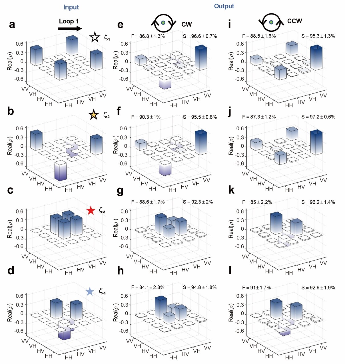 四個輸出態的理論密度矩陣如圖 2 所示。圖 2e-2h 對應的是順時針變化的情況,而圖 2i-2l 對應的是逆時針變化的情況。為便于比較,圖 2a-2d 顯示了輸入狀態的密度矩陣。圖 2a-2d 中的白色、黃色、紅色和藍色星號與圖 1b 中標注的星號相對應,分別代表輸入態