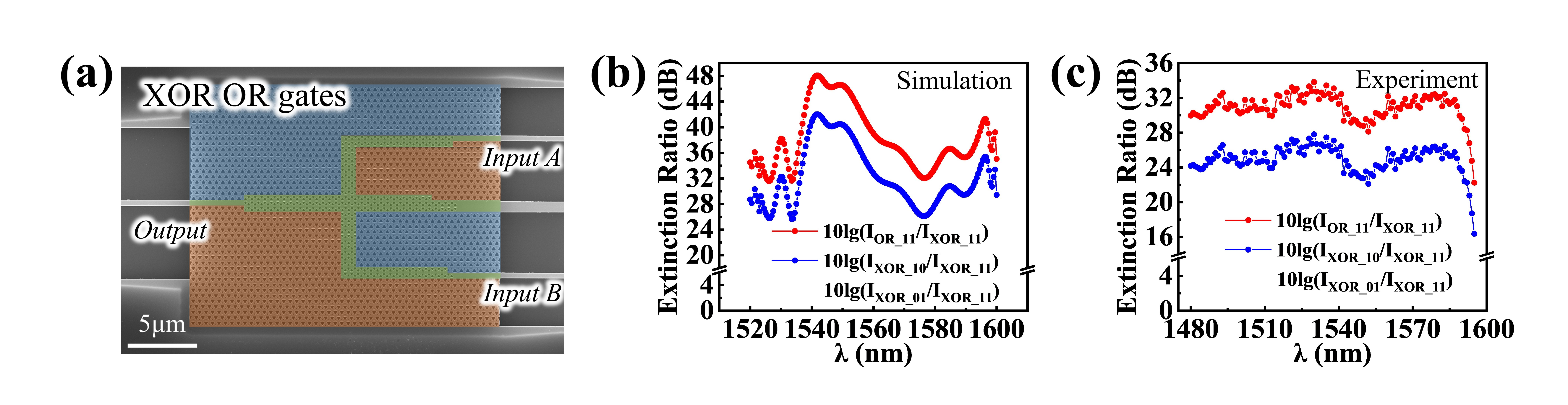 倍。當其中一個輸入信號(輸入A和輸入B)開啟時,輸出端口發生干涉相消現象,輸出信號為0。對于其他輸入狀態(輸入信號都開啟或關閉),輸出幅度不為零,對應邏輯輸出信號為1。消光比的實驗和模擬結果分別如圖3b和3c所示。實驗結果表明,在1480-1580 nm的通信頻段內,工作帶寬約為100 nm (ER>20 dB),最大消光比達到25.72 dB。理論和實驗結果均表明,XNOR門具有良好的效率。使用同樣的方式,研究人員分別實現了NAND(偏置光的振幅是輸入A(B)的2倍), NOR(偏置光的振幅為輸入A(B)處振幅的0.75