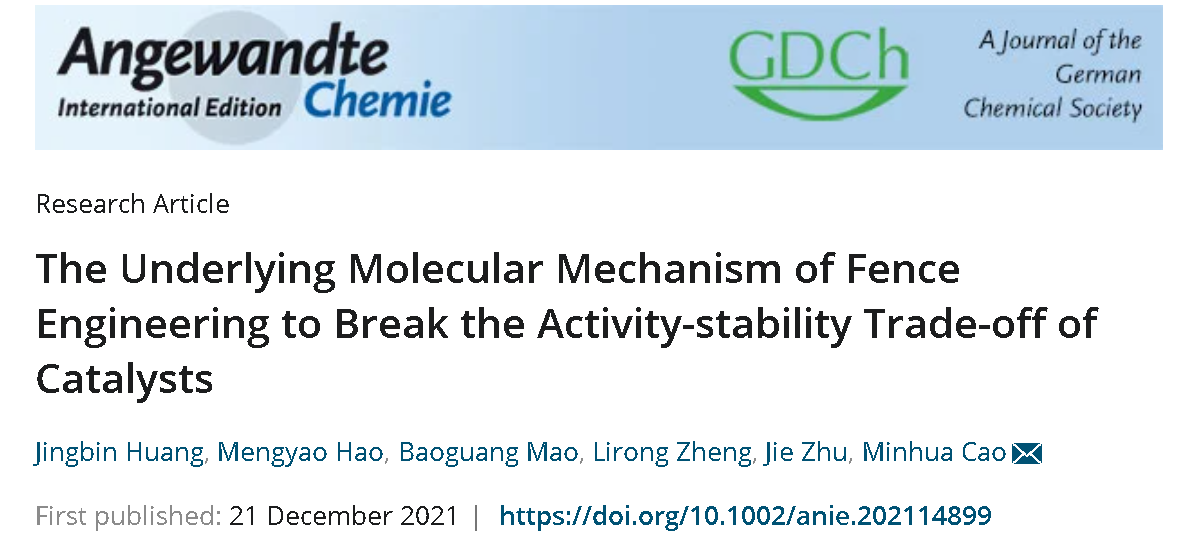 論文詳情:Jingbin Huang,+ Mengyao Hao,+ Baoguang Mao,* Lirong Zheng, Jie Zhu, and Minhua Cao*. The Underlying Molecular Mechanism of Fence Engineering to Break the Activity-stability Trade-off of Catalysts, Angewandte Chemie International Edition, DOI: 10.1002/anie.202114899. 論文鏈接:https://doi.org/10.1002/anie.202114899