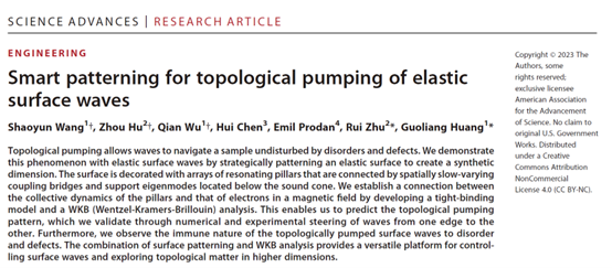 近日,北京理工大學大學宇航學院朱睿教授聯合美國密蘇里大學黃國良教授在彈性表面波拓撲輸運研究方面取得新進展。相關成果以“Smart patterning for topological pumping of elastic surface waves”為題,在Science Advances上發表[Sci adv (2023) 9, eadh4310]。北京理工大學宇航學院朱睿教授和美國密蘇里大學黃國良教授為論文的共同通訊作者。北京理工大學宇航學院博士研究生胡洲為論文的共同第一作者,完成了論文的樣品制備和實驗測試部分。該研究工作得到了國家自然科學基金委的資助。