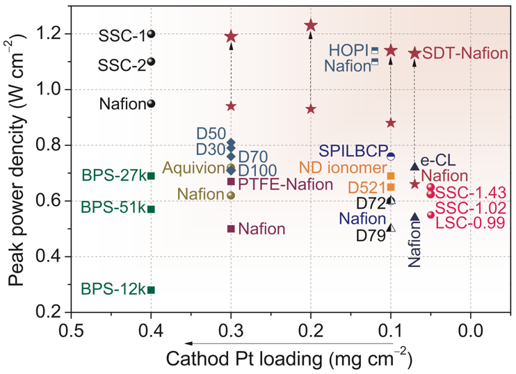 通過多孔離聚體的設計理念,即在不犧牲質子傳導性的條件下引入具有豐富介孔的剛性開發(fā)框架納米片,可大幅提升燃料電池的性能。在超低鉑的含量下,其功率密度達到了新的記錄,這意味著有望將產生1 kW電的費用降低三分之一左右。此外,美國能源部(DOE)設定的2025年的目標是將膜電極中鉑族金屬總含量降至0.1 g kW?1。使用多孔COF離聚物優(yōu)化催化層的結構之后,商業(yè)催化劑即可接近這個目標。