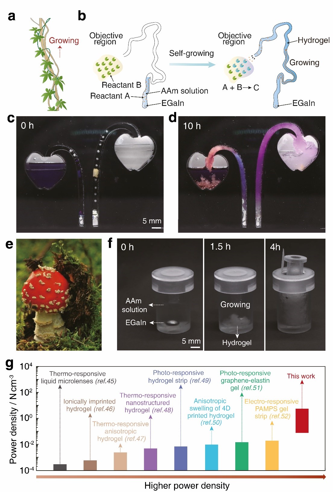 水凝膠的自生長行為成功模擬自然爬藤現象(圖2 a-d),在軟壁攀爬機器人中顯示出巨大的前景,在小型彎曲管道方面具有明顯的優勢。此外,受自然植物“破土而出”啟發,研究團隊將自生長“動力”轉化為“驅動力”,設計了自生長水凝膠致動器(圖2 e-f),成功將一特定容器打開。與大部分水凝膠致動器需要光/熱/電等外界能量觸發不同,自生長水凝膠致動器不需要輸入任何額外能量,且功率密度顯著高于其他水凝膠致動器,體現出自發、高效、可控的致動功能。