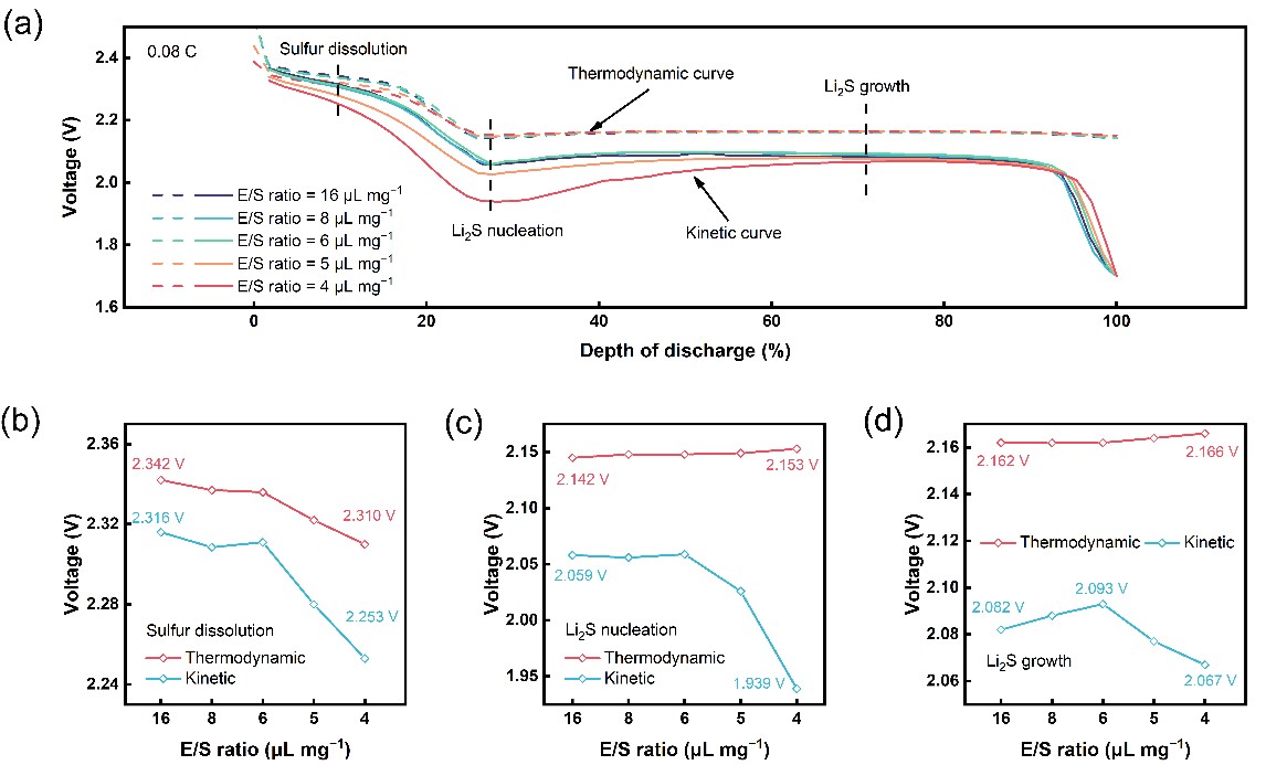 作者通過(guò)恒電流間歇滴定技術(shù)(GITT),分析了一系列E/S ratio條件下鋰硫電池放電階段的熱力學(xué)和動(dòng)力學(xué)(圖1)。將GITT放電步驟的最終電壓視為該放電深度下的動(dòng)力學(xué)電壓點(diǎn),靜置步驟的最終電壓視為熱力學(xué)電壓點(diǎn)。將動(dòng)力學(xué)電壓點(diǎn)和熱力學(xué)電壓點(diǎn)分別連接成線得到熱力學(xué)(Thermodynamic curve)和動(dòng)力學(xué)放電電壓曲線(Kinetic curve)。隨著E/S ratio的下降,鋰硫電池放電熱力學(xué)電壓基本不變而放電動(dòng)力學(xué)電壓顯著下降,表明E/S ratio下降導(dǎo)致鋰硫電池正極動(dòng)力學(xué)變得遲滯,制約全電池的性能發(fā)揮。
