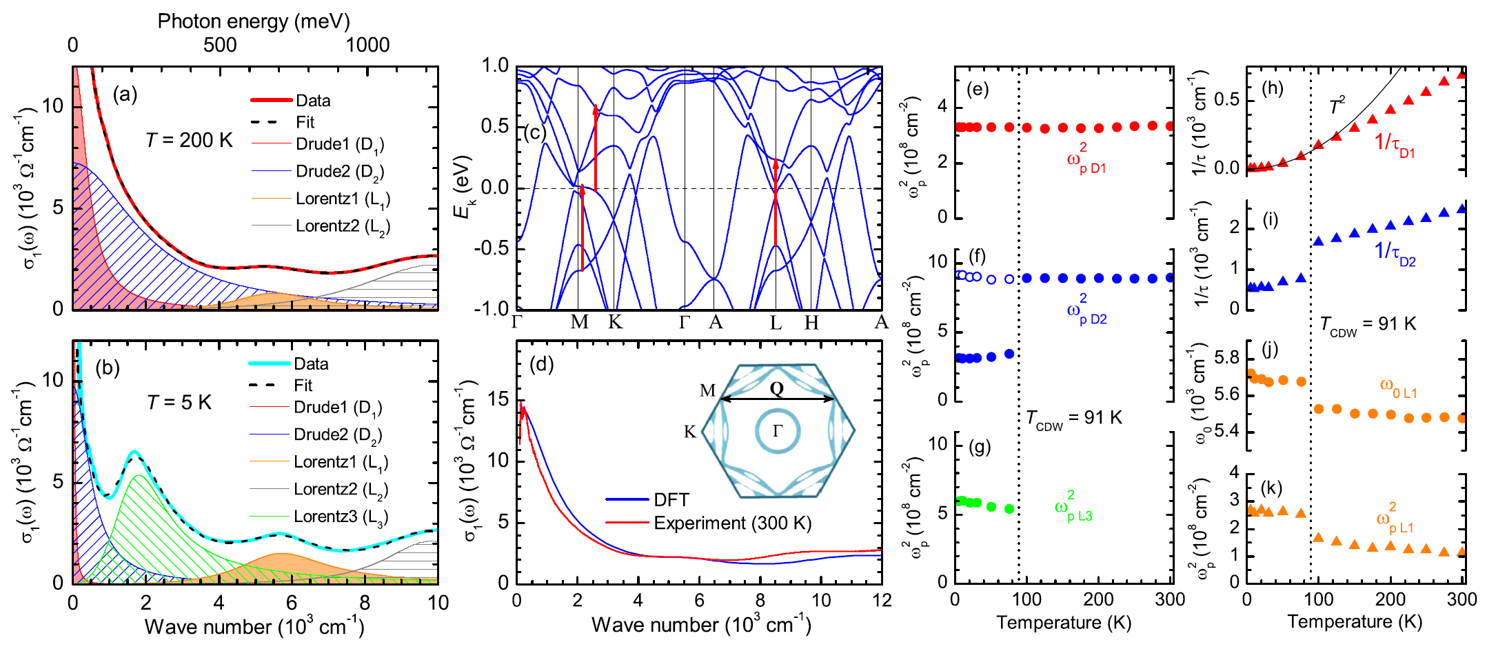 圖4 光電導譜的擬合,計算得到的能帶結構圖,實驗與理論的光電導譜對比,以及擬合得到的各種參數的溫度依賴