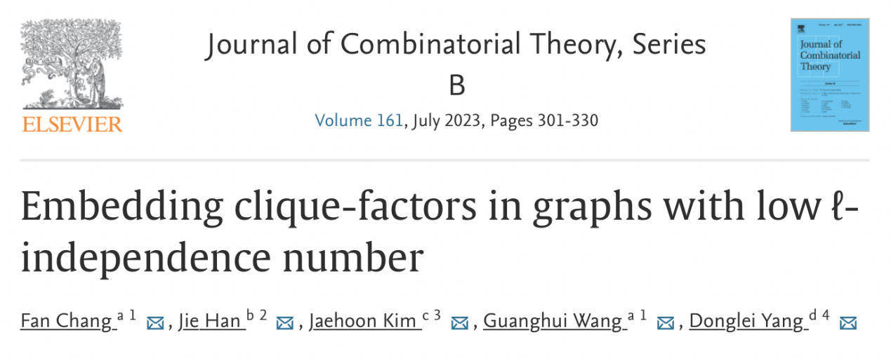 韓杰與山東大學的王光輝教授團隊和韓國科學技術院大學的JaehoonKim教授在最新的研究中決定了獨立數次線性圖中團因子存在性的最優度條件,并否定了前人提出的猜想。在另一研究中,韓杰與華中師范大學教師丁來浩、山東大學王光輝教授團隊研究了擬隨機超圖中退化F因子存在性的最優密度問題并得到了一系列成果。其中關于3一致超圖中因子問題得到的密度(上)界匹配了著名數學家Mubayi于2016年得到的下界。