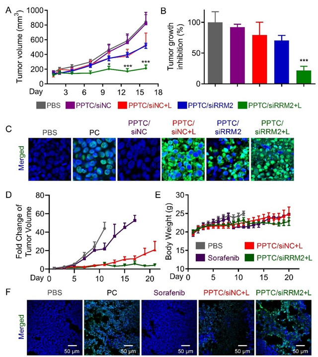 進一步,研究人員在小鼠上分別建立了肝癌細(xì)胞系異種移植的CDX模型(圖3A-C)和肝癌患者癌組織異種移植的PDX腫瘤模型(圖3D-F)。研究表明,在這兩種腫瘤模型中,PPTC/siRNA藥物體系均可有效抑制腫瘤生長,促進癌細(xì)胞凋亡。值得注意的是,數(shù)據(jù)證明該藥物體系表現(xiàn)出良好的光動力與siRNA治療協(xié)同效應(yīng),相比于單獨使用siRNA或單獨進行光照處理,二者聯(lián)合可顯著提高RRM2的基因沉默效率,提升小鼠腫瘤生長的抑制效果(圖3A-B)。同時,該復(fù)合物在細(xì)胞和動物體內(nèi)都展現(xiàn)出了良好的安全性。