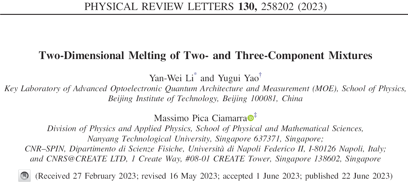 近日,北京理工大學物理學院李艷偉研究員、姚裕貴教授同新加坡南洋理工大學數學物理學院Massimo Pica Ciamarra教授合作,在二維熔化研究中取得重要進展,相關結果發表在物理學頂尖期刊Physical Review Letters上。