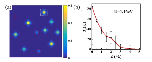 圖2 (a)頂角氧缺陷附近形成的局域磁矩。 (b) 超導(dǎo)臨界溫度作為頂角氧缺陷濃度的函數(shù)。