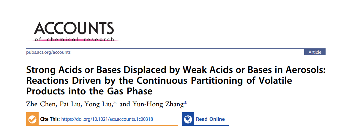 近日,Accounts of Chemical Research(《化學研究評述》)以“Strong Acids or Bases Displaced by Weak Acids or Bases in Aerosols: Reactions Driven by the Continuous Partitioning of Volatile Products into the Gas Phase”為題,在線發表了北京理工大學化學與化工學院張韞宏團隊的綜述文章,討論了氣溶膠體系中弱酸(弱堿)置換強酸(強堿)的獨特現象。