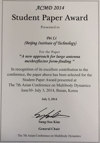會議期間,經過國際同行專家嚴格評審,胡海巖教授指導博士生李培完成的論文“A new approach for large antenna mesh reflector form-finding”獲得學生論文獎(共5名,中國學生1名)。