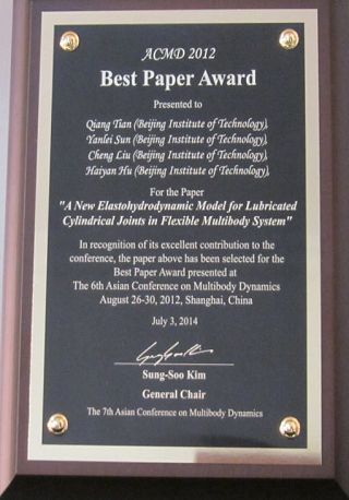 本次大會還頒發了2012年第6屆ACMD會議的最佳論文獎(共3名,中國學者1名),由田強副教授等聯合撰寫的論文“A new Elastohydrodynamic Model for Lubricated Cylindrical Joints in Flexible Multibody System”獲此殊榮。