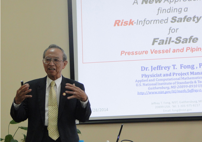 2014年8月29日,應機械與車輛學院徐春廣教授邀請,美國國家科技標準研究院資深學者、美國費城德雷塞爾與加州斯坦福兩所大學客座教授、美籍華人方資慧博士來我校先進加工技術重點學科實驗室進行訪問交流。訪問期間,方博士參觀了機械與車輛學院的檢測與控制研究所,并為師生作了題為“A New Approach to finding a Risk-informed Safety Factor for Fail-Safe Pressure Vessel and Piping Design”的學術報告。方博士通過介紹“應用數學”、“應用物理”、“應用物理”三門科技理論,闡述“無損探傷數量工藝技術學”的內涵。同時,方博士還為我們展示了統計分析軟件以及如何應用現代統計學結合統計分析軟件進行實驗設計。方博士的語言詼諧、幽默、生動,報告的內容引起與會師生的濃厚興趣,展開了熱烈的討論。