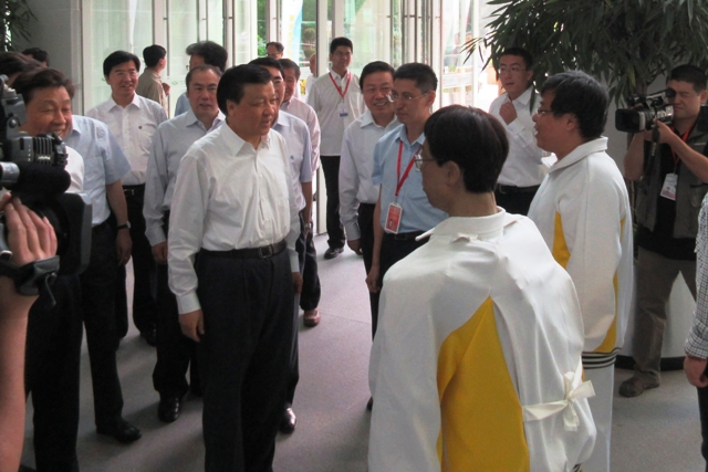 上午9時許,中央政治局常委、中央書記處書記劉云山,中央政治局委員、中央書記處書記、中央宣傳部部長劉奇葆,中央政治局委員、國家副主席李源潮,中央政治局委員、北京市委書記郭金龍,十二屆全國政協副主席、九三學社中央主席、中國科學技術協會主席韓啟德等中央領導來到我校展臺前,分別聽取了機電學院黃強教授和自動化學院楊毅副教授的介紹,饒有興趣的觀看了機器人的表演,對我校師生的作品表示了充分的肯定。
