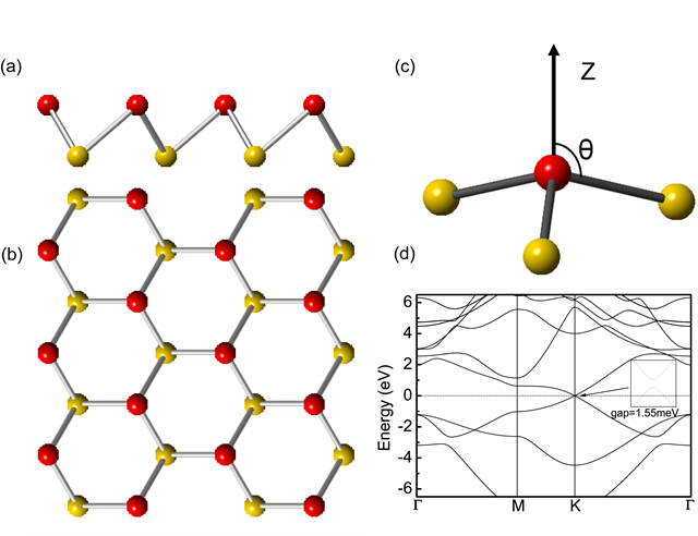 圖1 硅烯的晶體結構和能帶圖。(a),(b)分別為側視圖和俯視圖。(c)定義了一個起伏角度。(d) 能帶圖。放大的部分為由于自旋軌道耦合作用在狄拉克點打開的能隙結構。