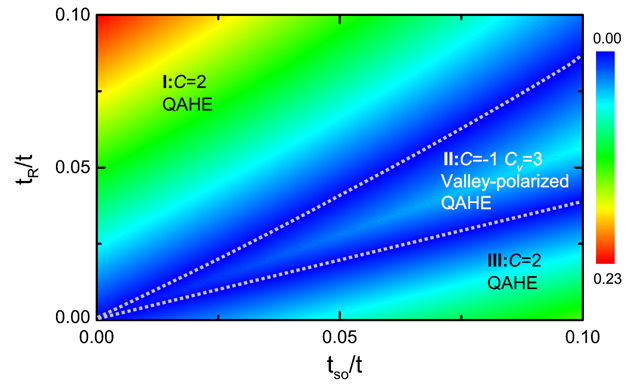 圖3 硅烯在內稟Rashba tSO和外在Rashba tR二維參數空間的相圖。點線代表相邊界。相I和相III是陳數C=2的量子反常霍爾態,相II是陳數C=-1,以及谷陳數Cv=3的谷極化量子反常霍爾態。