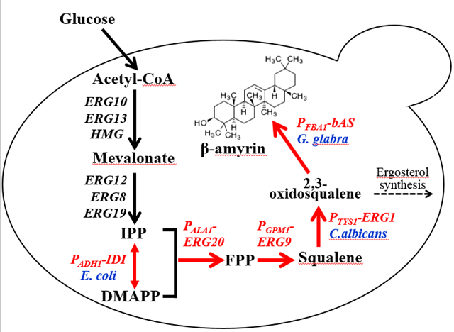 在科技部“863”重大計劃、國家杰出青年科學基金等項目的資助下,北理工生命學院李春教授課題組利用合成生物學和系統生物學方法在釀酒酵母進行五環三萜β-香樹脂醇的研究工作,取得了重要進展。三萜是植物天然產物中最大的一類次生代謝產物,在抗炎癥、抗菌及抗病毒感染和癌細胞防治方面具有良好的藥物活性,其中β-香樹脂醇還具有保肝護肝等功效,但因其在植物中含量低和結構復雜等因素限制了其廣泛應用和化學合成研究。