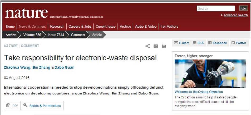 北京理工大學王兆華教授和張斌博士與英國東英吉利大學Dabo Guan教授在前期工作的基礎上,分析了全球電子廢棄物流向和回收處置不均衡的問題。研究成果“Take Responsibility for Electronic-waste disposal”發表于Nature的Comment欄目(文章鏈接:http://www.nature.com/news/take-responsibility-for-electronic-waste-disposal-1.20345),這也是中國學者首次在Nature上探討電子廢棄物回收處置話題。