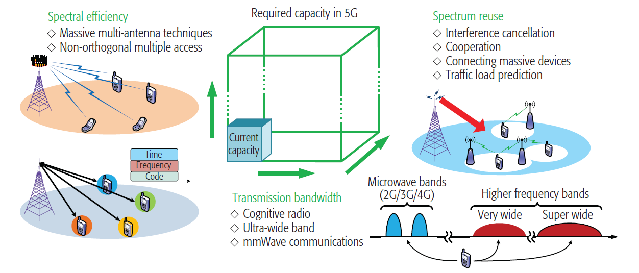 另一方面,經典的香農容量公式揭示了下一代無線蜂窩網絡提高系統容量的三個主要技術路線及相關關鍵技術:更多數目的子信道,如大規模多輸入多輸出(Multiple-Input-Multiple-Output,MIMO)技術和非正交多址接入(Non-Orthogonal Multiple Access,NOMA)技術;更大的傳輸帶寬,如通過頻譜共享的認知無線電(Cognitive Radio,CR)、超寬帶(Ultra-Wide Band,UWB)傳輸和通過頻譜擴展的毫米波通信技術;通過增加單位面積更多的小區來獲得更好頻譜復用的技術,如超密集組網(Ultra-Dense Network,UDN)技術。