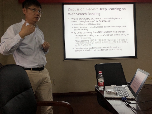 在講座中,常毅教授首先介紹了互聯(lián)網(wǎng)搜索行業(yè)所面臨的一些問題與困境,并闡明搜索精準(zhǔn)度對于互聯(lián)網(wǎng)搜索引擎的重要意義。進(jìn)而對搜索精確度的具體方法進(jìn)行枚舉闡述。常毅教授主要從排序?qū)W習(xí)和系統(tǒng)工程兩個層面上介紹該領(lǐng)域和進(jìn)行工作展望。他深入淺出的報告和獨(dú)到見解令在座師生都有所收獲。