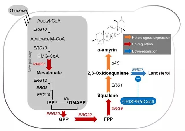 萜類化合物是植物次級代謝產物中最大的一個家族,廣泛分布于自然界中,α-香樹脂醇是植物當中重要的五環三萜,具有重要的生理和藥理活性。α-香樹脂醇是由(3S)-2,3-氧化鯊烯在氧化鯊烯環化酶蛋白家族α-香樹脂醇合酶(α-AS)的催化下形成的。由于α-香樹脂醇在植物中的含量極低,分離純化步驟繁雜,目前尚未商業化開發生產。利用整合了高效α-AS的工程化釀酒酵母,可用作α-香樹脂醇的可持續生產方案。
