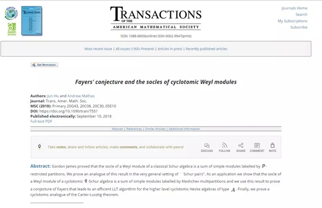 北京理工大學數學與統計學院胡峻教授在國際頂級學術期刊《Transactions of the American Mathematical Society》上發表了題為“Fayers’conjecture and the socle of cyclotomic Weyl modules”的研究論文。該論文研究了分圓Schur代數的分圓Weyl模的基座,證明了這些基座中的單模全部都是由Kleshchev多重剖分來參數化,并在此基礎上證明了英國代數學家Fayers提出的關于Fock空間典范基的一個猜想。