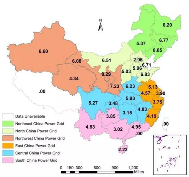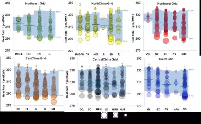 本研究首先測算了中國六大區域電網內所有煤電機組的燃料消耗率,發現2014年中國煤電機組的燃料消耗率位于273.91 gce/kWh和348.38 gce/kWh之間。同時,無論是在省級電網層面、區域電網層面和全國層面,同一電力平衡區域內煤電機組的燃料消耗率均存在著不同程度的差異,說明了電力系統的調度機制改革存在著一定的節能空間。