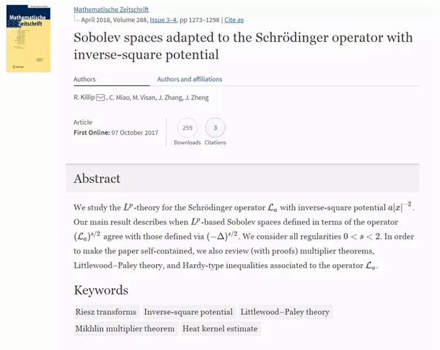 日前,北京理工大學數學與統計學院張軍勇特別研究員與及其合作者在國際數學頂級學術期刊《Mathematische Zeitschrift》上發表了題為“Sobolev spaces adapted to the Schr?dinger operator with inverse-square potential”的研究論文。該論文通過建立含反平方位勢薛定諤算子所對應的Littlewood-Paley 理論、乘子定理、Hardy 不等式等調和分析工具,證明了含反平方位勢薛定諤算子在L^p框架下的Sobolev空間與經典的Sobolev空間的等價性。