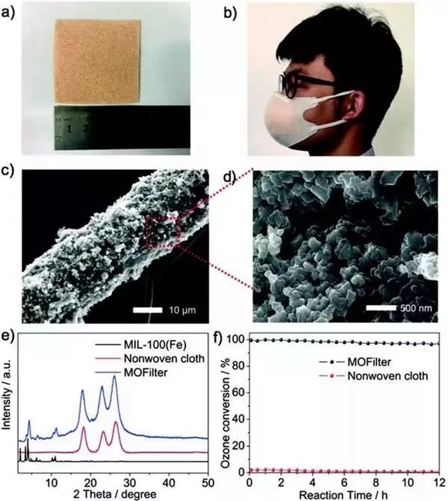 MOFilter的制作及其應用測試(a,b)MOFilter的照片和包含MOFilter的口罩。c)MOFilter的SEM圖像。d)(c)中方框的放大圖像。e)模擬MIL-100(Fe),無紡布和MOFilter的XRD圖案。f)MOFilter上的臭氧去除,入口臭氧濃度為200ppb,室溫下RH為45%。)