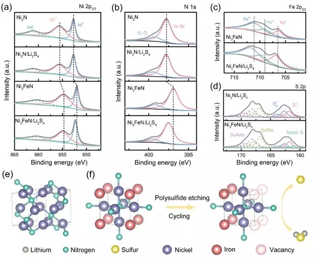 類似于金屬催化劑設計的合金化策略,該團隊在單金屬化合物中引入外在金屬,活化了原來的惰性相化合物,從而促進多硫化物的表面反應動力學。以六方氮化鎳(Ni?N)作為概念驗證,其對多硫化物的催化活性較差。在引入鐵元素后,Ni?N轉變為高活性的立方鎳鐵氮化物(Ni?FeN)。在Ni?FeN中,處于立方結構頂角處的較高正電性的鐵(與鎳相比)傾向于通過多硫化物的刻蝕過程浸出,從而在鎳位點的周圍留下大量空位缺陷,極大地提高了Ni?N的催化活性。