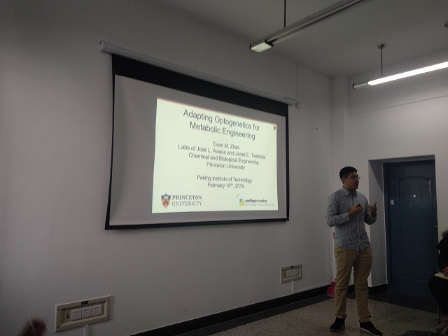 應北京理工大學化學與化工學院生化工程系/合成生物系統研究所邀請,美國普林斯頓大學(Princeton University)化學工程系Evan M. Zhao博士于2019年2月18日上午來到北京理工大學化學與化工學院生化工程系/合成生物系統研究所,為北理工師生帶來題為“Light-Dependent Pathway Enhancement for Microbial Chemical Production”的學術報告。李春教授主持本次學術報告會,化學與化工學院、求是書院、天津大學的部分教師及研究生五十余人參加了報告會。