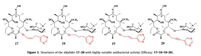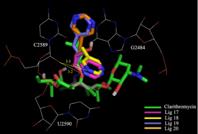 紅霉素抑制細(xì)菌核糖體中蛋白的輸出,是抑菌劑。臨床用于細(xì)菌性肺炎和支原體肺炎感染等致死性重癥的治療。目前這類(lèi)耐藥菌主要是識(shí)別紅霉素,表達(dá)外排泵蛋白并將其外排到細(xì)胞外,或者表達(dá)甲基化轉(zhuǎn)移酶將核糖體RNA上原先紅霉素結(jié)合靶點(diǎn)甲基化,降低相互作用力。梁建華團(tuán)隊(duì)去除了會(huì)誘導(dǎo)細(xì)菌識(shí)別的3-O克拉定糖基團(tuán),引入了新型具有構(gòu)象限制的1-Z-丙烯基側(cè)鏈,恢復(fù)了紅霉素的藥效構(gòu)象,發(fā)表在European Journal of Medicinal Chemistry, 2012, 49, 289;Bioorganic & Medicinal Chemistry Letters, 2013, 23(5): 1387;Bioorganic & Medicinal Chemistry, 2015, 23(19): 6437。率先披露了新靶點(diǎn)區(qū)域位置,后被其它課題組培養(yǎng)的核糖體共單晶結(jié)構(gòu)進(jìn)一步證實(shí)。