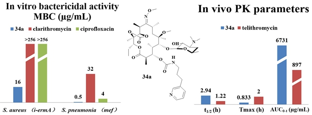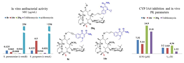 耐藥菌還有一類(lèi)組成型耐藥菌,即使不存在誘導(dǎo)基團(tuán),也會(huì)表達(dá)甲基化轉(zhuǎn)移酶,它們往往對(duì)多種類(lèi)型抗生素(如甲氧西林、環(huán)丙沙星和阿奇霉素等)耐藥,是典型的超級(jí)耐藥菌。針對(duì)這類(lèi)耐藥水平非常高的耐藥菌,需要引入的新靶點(diǎn)具有高親和力。該團(tuán)隊(duì)前期發(fā)現(xiàn)側(cè)鏈末端的雜芳基上引入氨基或者氨基甲酰基取代基,可以提高抗耐藥菌活性,但是組成型細(xì)菌仍然對(duì)其不敏感(Bioorganic & Medicinal Chemistry Letters, 2017, 27(7): 1513-1524)。 近期,該團(tuán)隊(duì)開(kāi)發(fā)了第四代紅霉素,通過(guò)雜合的手段引入3-羧基喹喏酮結(jié)構(gòu),發(fā)現(xiàn)有助于提高抗組成型耐藥菌活性,但是活性中等,進(jìn)一步改造喹喏酮子結(jié)構(gòu),首次引入了3-氨基甲酰基喹喏酮,獲得了很高的抗組成型耐藥菌活性,同時(shí)對(duì)其它耐藥機(jī)制細(xì)菌的抗菌活性也非常優(yōu)異,且優(yōu)于對(duì)比類(lèi)似結(jié)構(gòu)藥物如克拉霉素和環(huán)丙沙星等,與第三代抗耐藥菌紅霉素-泰利霉素體外活性相當(dāng)或更優(yōu)越。體內(nèi)藥代動(dòng)力學(xué)研究顯示優(yōu)選化合物的體內(nèi)代謝穩(wěn)定性遠(yuǎn)高于泰利霉素,有效避免了泰利霉素產(chǎn)生肝毒性的結(jié)構(gòu)特點(diǎn),藥代性質(zhì)優(yōu)異,同時(shí)具有較低的代謝酶CYP3A4的抑制率,安全性比泰利霉素高,因?yàn)樵摯x酶負(fù)責(zé)代謝臨床上近一半的藥物。該文章最近發(fā)表于藥物化學(xué)頂級(jí)期刊European Journal of Medicinal Chemistry, 2019, 169, 1-20。第一作者是在讀碩士研究生馬聰璇。(文章鏈接:https://www.sciencedirect.com/science/article/pii/S0223523419302053