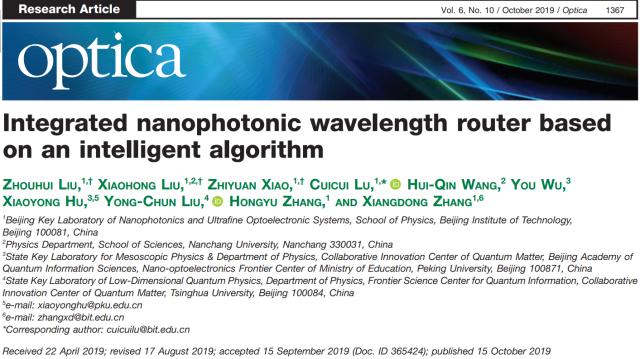 文章信息:Zhouhui Liu,? Xiaohong Liu,? Zhiyuan Xiao,? Cuicui Lu,* Hui-Qin Wang, You Wu, Xiaoyong Hu, Yong-Chun Liu, Hongyu Zhang, and Xiangdong Zhang, "Integrated nanophotonic wavelength router based on intelligent algorithm", Optica 6, 10, 1367-1373 (2019). (?為共同一作;*為通訊作者。)