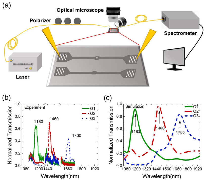 北京理工大學物理學院張向東教授團隊的特別副研究員路翠翠等人,提出了一種將有限元方法與遺傳算法結合的智能算法,打破已有結構限制,能夠預測未知的新型結構,在全參數空間自動探索尋優,得到滿足光子芯片要求的片上波長路由納米器件,并且對任意光學材料都適用。他們成功設計并在實驗上實現了超小型寬帶易集成的光波長路由納米器件。工作在近紅外通訊波段,器件尺寸只有1.4μm × 1.8μm,這是目前國際上最小的片上光波長路由納米器件。利用該智能算法能夠同時實現寬工作波段、高透射率、多通道大信息容量輸出;并且可以省時省力在短時間內方便地設計出任意線性光學材料(介質和金屬等)、不同通道、不同結構單元數量或尺寸的各種波長路由器件。此外,器件結構簡單,易于制備,適合片上集成應用。